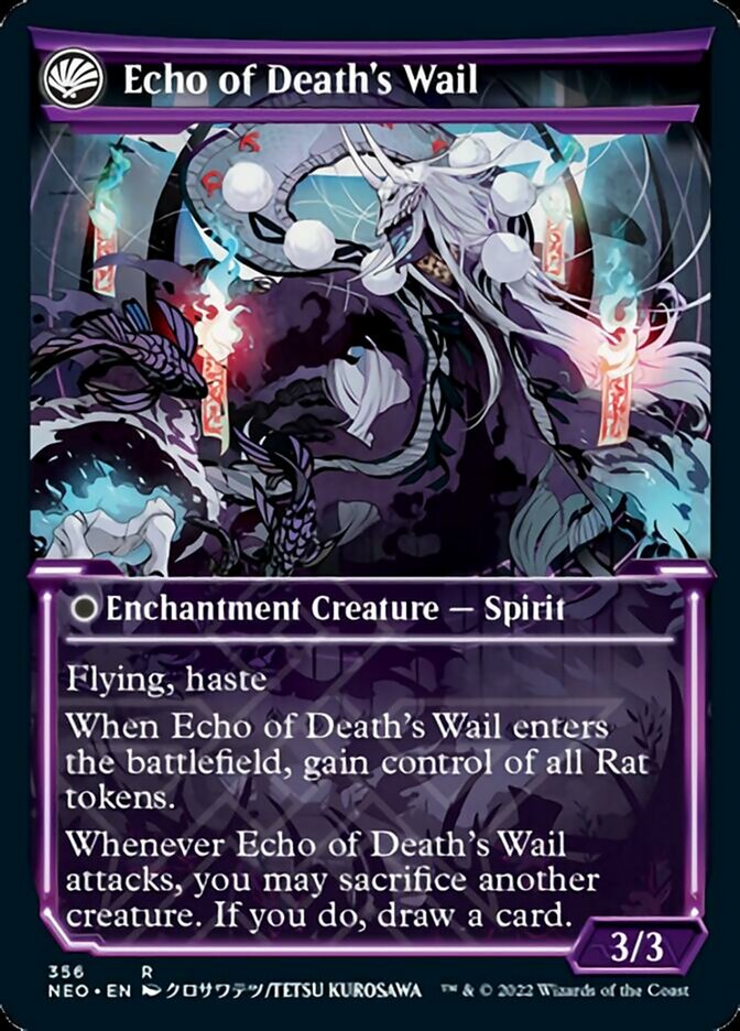 (As this Saga enters and after your draw step, add a lore counter.) I, II ? Each opponent creates a 1/1 black Rat Rogue creature token. III ? Exile this Saga, then return it to the battlefield transformed under your control. Echo of Death's Wail Color Indicator: Black Enchantment Creature ? Spirit Flying, haste When Echo of Death?s Wail enters the battlefield, gain control of all Rat tokens. Whenever Echo of Death?s Wail attacks, you may sacrifice another creature. If you do, draw a card. 3/3